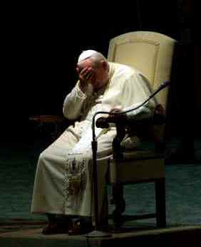 Papa Giovanni Paolo II si riprende appoggiandosi su una seggiola arrivando alla Sala Nervi in Vaticano. Il Papa per un forte dolore al ginocchio destro ha dovuto cancellare tutti gli impegni che lo fanno camminare. Pope John Paul II leans on a chair as he arrives in the Aula Nervi at Vatican. The Pope had to cancel all the engagements that made him walk due to a strong pain at his right knee .