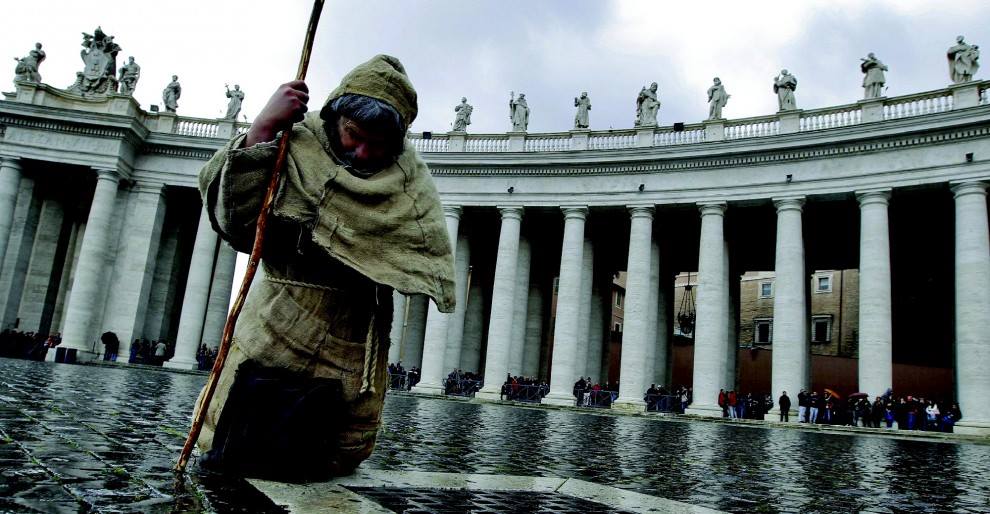 Penitential prayers have borne much fruit, A year after the election of Pope Francis we again present the photo symbol of "the pilgrim of Assisi”, Massimo Coppo, kneeling on a sewer in St Peter's Square, wearing the sackcloth and barefoot under the rain, during the course of the Conclave. A "prophetic" photo which has gone round the world. We have asked Massimo what he feels in seeing again that image. <<I prayed for a Pope close to the poor who would speak of eternity>>, Massimo remembers, <<and so I answered to the many who asked me about the reason for that penance. I felt and I still feel to be just a "sewer", and behind my prayer there was that one certainly more effective of Marcello Ezekiel Ciai, the "prophet of Assisi" founder of my Community Families of Bethlehem, who had felt the inspiration of "placing me" as an icon of prayer in St. Peter's Square during the Conclave. From Assisi together with Marcello and my community, with our prayers and our witness we continue to support the Pope so that he may continue with increasing firmness, with the indomitable humility and passion of St. Francis, to renew a poor Church, sided with the poor and that would proclaim those "words of eternal life" (Gospel of John 6:68) and of eternal judgment that many in the world today - and unfortunately even many religious - don’t want to hear any more.>>