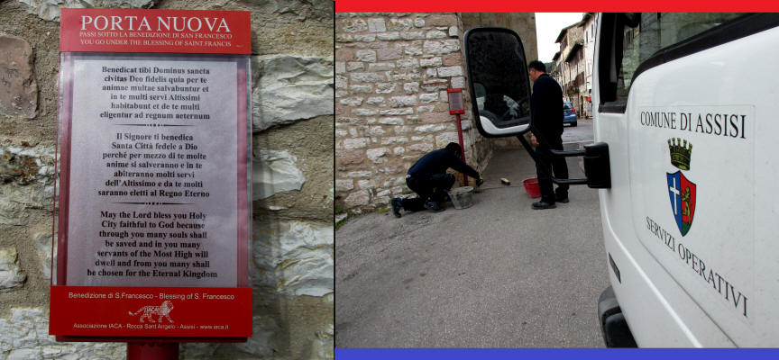 The resonance and splendor of Assisi are growing more and more. Assisi is the most famous sanctuary-city of the world, indissolubly tied to the most universally known and loved Saint: Saint Francis, whose name significantly was assumed by the current Pontiff, considered and looked by all like as the most important, influencial and well-liked leader. The Association IACA, set up and operating in Assisi since more than 20 years, amongst its initiatives meant to let the world know the wonders of Umbria and in particular the mysterious charm and prophetic message of Assisi, has honored the Seraphic City and its Saint installing at Porta Nuova, one of the eight medieval gates of Assisi, a plate where now one can read also in Italian and in English the blessing inscribed in Latin, high up on the arch of the Gate. A precious blessing that St. Francis, before his death, gave to his beloved city and to those who pass through it, which still mysteriously flutters above Assisi.